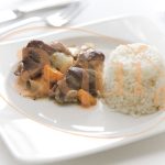 - Cortar a carne en cadrados regulares, salpementar e cubrir de fariña lixeiramente. Quentar o aceite nunha cazola e refogar a carne a lume forte ata que a superficie queda ligxeiramente dourada. Incorporar a cebola cortada en tiras, o allo picado fino, a cervexa e o caldo. Tapar a cazola e deixar cocer unhas 2 horas. Retirar do lume e deixar arrefriar media hora coa cazola tapada. Servimos o estufado de carne moi quente, acompañado da cebola que quede enteira e coa salsa resultante, e cun arroz branco.
