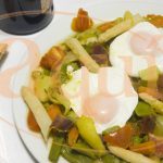 - Douramos os ingredientes con aceite quente na base dunha cazola. Despois, cocemos a mestura durante 20 min, escorremos e servimos. Opcionalmente, podemos servir con ovos escalfados, tomates e espárragos.