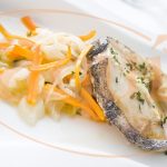 - Filetear a pescada, marcar á prancha e colocar nunha cazola de forno. Nunha pota refogar a cebola e a cenoria, engadir á pescada, mollar co caldo de peixe fornear a 170º ata terminar a súa cocción. Acompañar de pataca fervida.