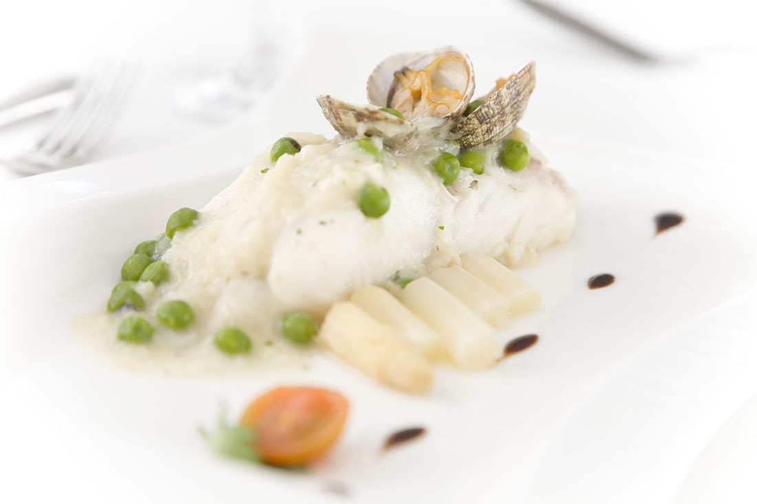 - Preparar unha salsa verde: refogar en aceite o allo e cebola picados sen que tome cor. Engadir un pouco de fariña e caldo de peixe. Deixar cocer 10 min. e engadir perexil picado. Introducir o lombo de pescada na salsa e meter no forno coas ameixas e chícharos durante 8 min. Acompañar na mesma cazola con patacas redondas cocidas e espárrago.