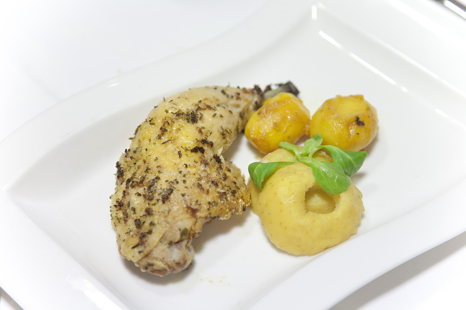 - Adóbase o polo co perexil, co allo e co sal machados no morteiro, cóbrese de manteiga e ponse a forno moderado coas mazás e coas patacas lixeiramente fritas en anacos grosos.