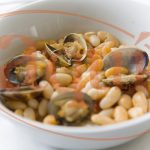 • Poner las alubias en remojo en agua fría, durante la noche anterior. Pochar la cebolla picada, el tomate pelado y cortado en trozos pequeños, el laurel, el ajo y el pimentón en el aceite y cubrir con agua fría. Cuando rompe el hervor, bajar el fuego, y dejar cocer lentamente, procurando que las alubias estén siempre cubiertas de agua para que no suelten la piel. Una vez tiernas, sazonar de sal e introducir las almejas hasta que se abran. Retirar del fuego y dejar reposar, tapadas, unos diez minutos antes de servirlas.
