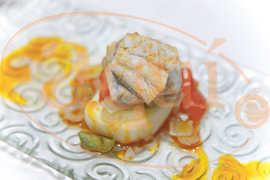 - Sofreímos en la base de una cazuela ajo y cebolla, una vez adquieran color añadimos es pescado, las patatas en rodajas y cubrimos todo con agua. El plato se servirá cubierto por una ajada hecha en aceite caliente con ajos y pimentón, dándole así mayor gusto al plato.
