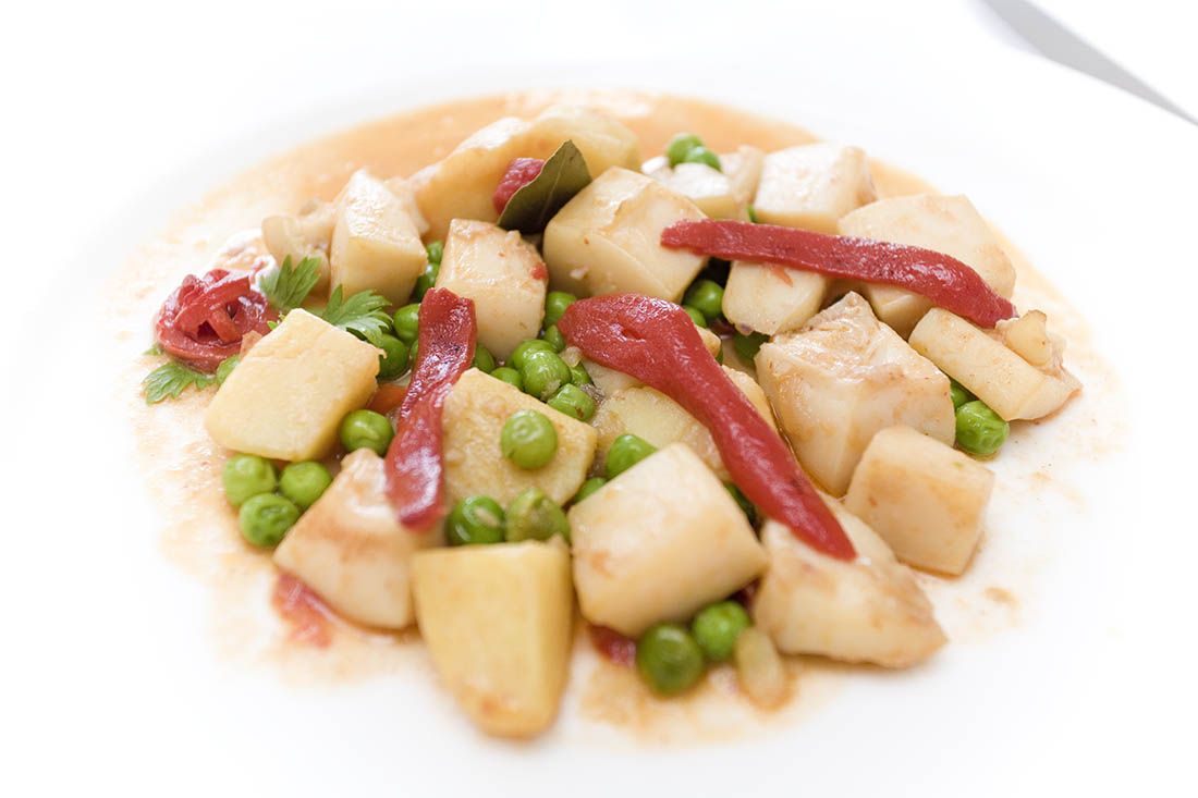 • Rehogar en aceite el ajo picado, la cebolla y el pimiento rojo en dados. Añadir la sepia dejar rehogar 10 min. aproximadamente. Introducir el pimentón dulce y la patata rota, mojar con el caldo de pescado. Añadir los guisantes y dejar cocinar hasta que la patata esté lista.
