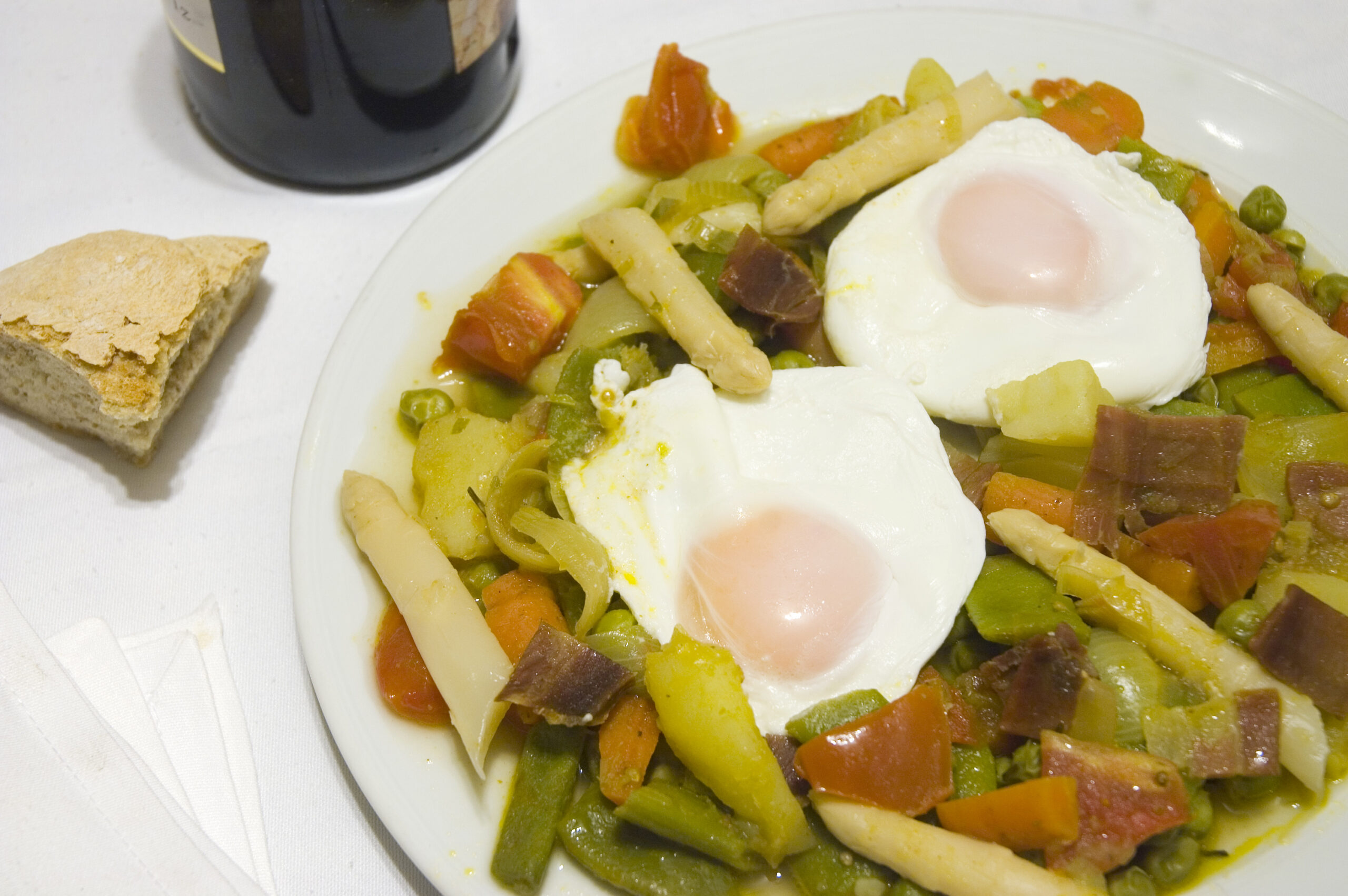 - Doramos los ingredientes con aceite caliente en la base de una cazuela. Después cocemos la mezcla durante 20 minutos, escurrimos y servimos. Opcionalmente se puede servir con huevos escalfados, tomates y espárragos.