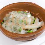 - Preparar la salsa verde: rehogar en aceite el ajo y la cebolla picados sin que tomen color. Añadir un poco de harina y caldo de pescado. Dejar cocer 10 min y añadir perejil picado. Cocer el lomo de merluza al vapor y cubrir con la salsa. Acompañar de unas patatas redondas cocidas, guisantes y espárrago.