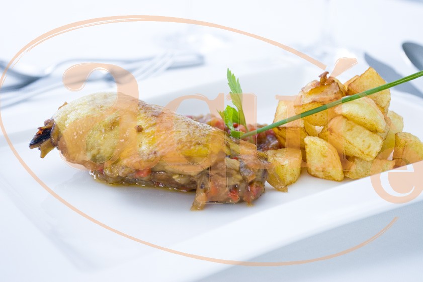 - Dorar el pollo en aceite. Retirar y añadir las verduras cortadas en dados, regar con el jerez, cocinar hasta evaporar el alcohol. Ligar con la harina, añadir el caldo y remover con varilla. Introducir el pollo y hervir hasta cocinarlo. Acompañar de patatas fritas.