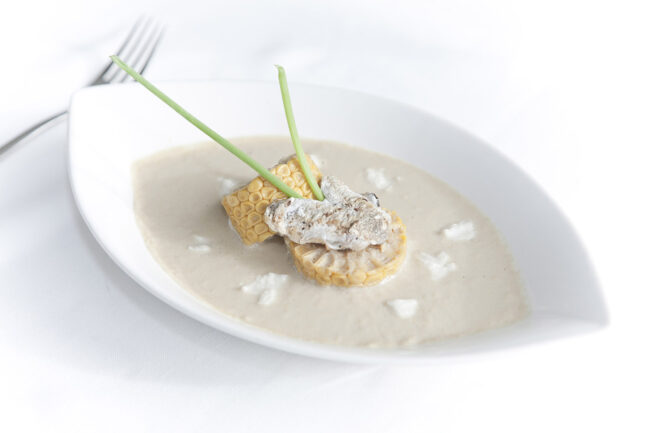 Sopa de maíz con cabezas de merluza