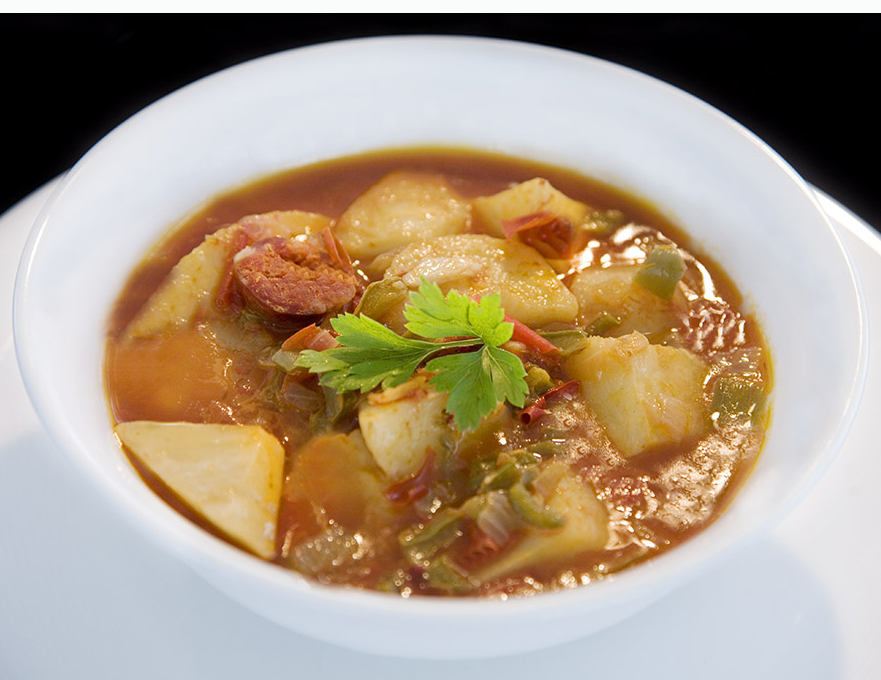 - Remojar los pimientos choriceros en agua caliente para acelerar el proceso de hidratación. Rehogar en aceite el pimiento verde, cebolla (en dados) y ajo. Añadir el pimentón, la patata rota en dados. Añadir la pulpa del pimiento choricero y cubrir con agua suficiente para cocer todo. Poner a punto de sal y dejar reposar.