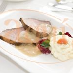 - Marcar el redondo entero en la sartén o plancha por ambas caras. Colocar en la placa del horno, regar con el vino blanco, añadir las verduras troceadas y asar durante 50 minutos a 170 ºC. Cortar el redondo en rodajas, añadir el caldo a la placa pasar por un chino con las verduras para obtener y elaborar la salsa. Servir con puré de patata y la salsa cremosa por encima.